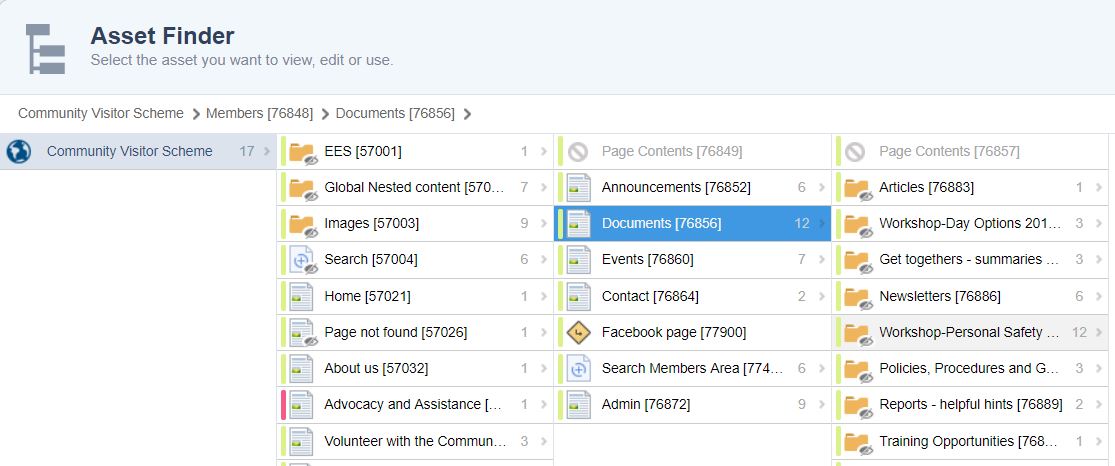 - A File Tree opens. Make sure that the section highlighted in blue is a Folder under Documents (asset 76856). Click to select the appropriate Folder you want your file to appear in. The web site automatically displays files and groups them according to their Fo;lder name - so be sure to put it in the correct place.